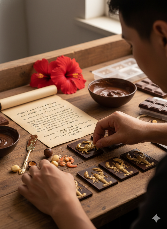 Our artisans carefully balance the rich depth of chocolate with the delicate texture of real seafood, crafting each piece with precision, patience, and passion.